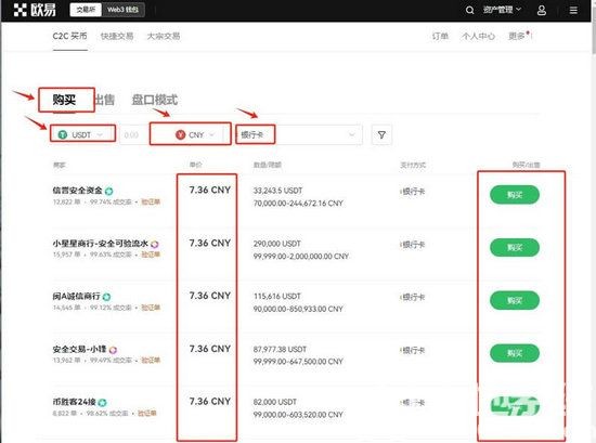 9、进行交易前需要拥有USDT,可在C2C买币进行交易,根据需求选择合适商家,点击“购买”,而后根据提示进行付款、等待商家放币(若是长时间没有收到币种,可联系客服进行处理)