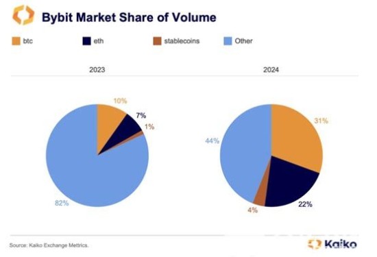 报告分析,Bybit的交易量增长是由BTC和ETH推动的,自去年以来,它们的市场份额从17%上升到53%。相较之下,币安则是在山寨币(竞争币)的交易量成长较为显著。下图中可以看到,Bybit在主要币种的交易大幅提升。