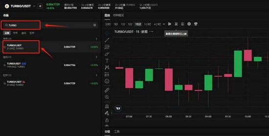 11、在搜索框输入TURBO,选择TURBO/USDT交易对,可以看到TURBO实时行情
