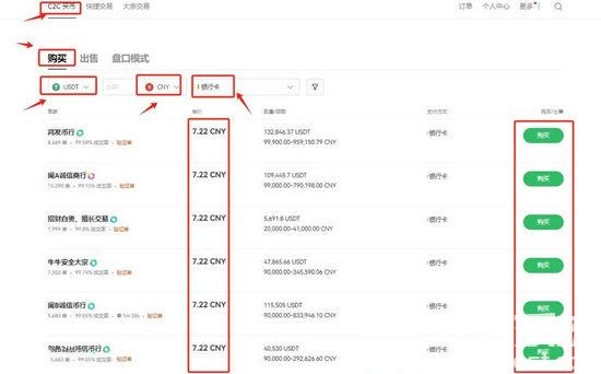 9、进行交易前需要拥有USDT,可在C2C买币进行交易,根据需求选择合适商家,点击“购买”,而后根据提示进行付款、等待商家放币(若是长时间没有收到币种,可联系客服进行处理)