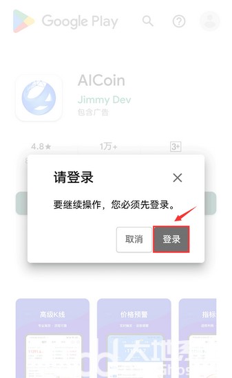 (3)在弹出的对话框中点击登录。注:AICoin APP是免费下载的。