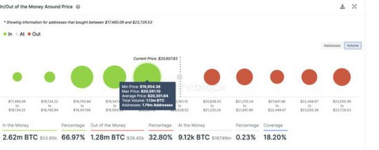 看起来,BTC 的短期价格走势受到多头情绪的支持。围绕价格的 In/Out Of Money 指标表明,比特币价格在 20,300 美元大关处得到强有力的支持,其中 179 万个地址持有 113 万个比特币。