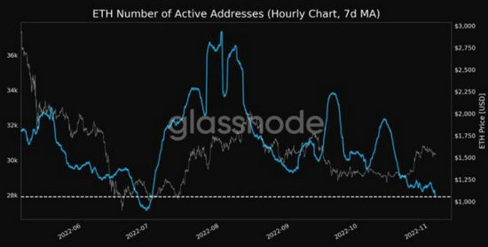 Glassnode 数据突出显示,ETH 活动地址数(7d MA)刚刚达到 27,908 的 4 个月低点。