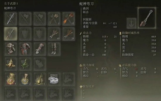 2、比如说这一把流浪骑士后期可以使用的蛇神弯刀,他就需要13点的力气,9点的敏捷,玩家在属性方面没有达到装备的要求,是无法使用这些装备的。