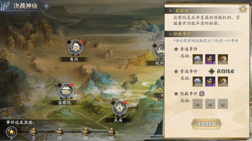 庆余年手游给玩家准备了各种各样的任务,完成任务后即可领取任务奖励,那我们怎么过决战神庙这个主线任务呢,首先我们开启决战神庙这个任务,接着探索不同的事件,搜集更多的线索,将线索放到正确的位置后获取钥匙,最后完成隐藏事件的探索即可。
