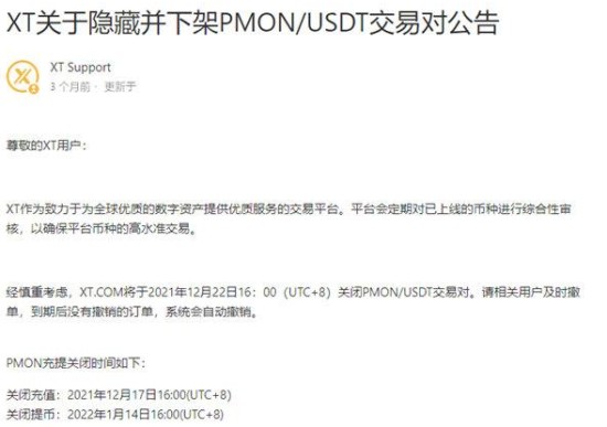 PMON目前没有上架交易所,之前上架的XT交易所已下架PMON/USDT交易对,公告如下: