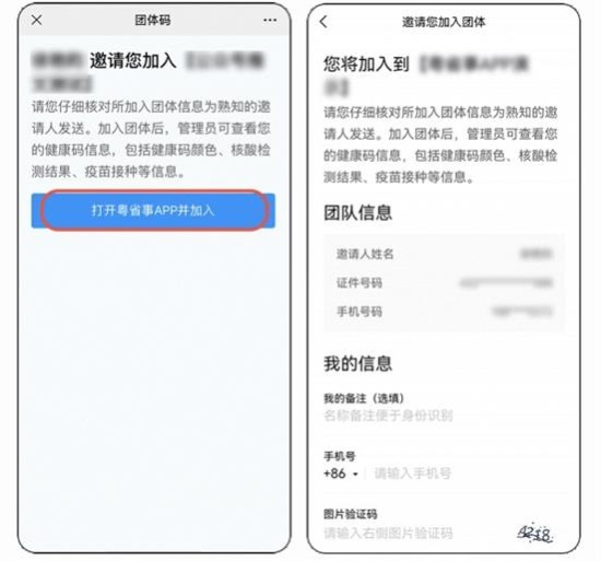2、成员通过点击邀请链接或扫描图片二维码的方式进入加入团体页面,点击“打开粤省事APP并加入”。进入授权页面后填写个人信息及验证码,勾选同意健康声明,点击“授权并加入团体”,完成加入团体。