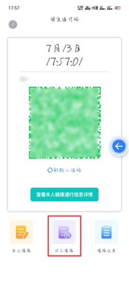 5.进入健康码展示页面后,展示的是我们的健康码,我们需要点击【代人填报】进入绑定其他用户的信息页面;