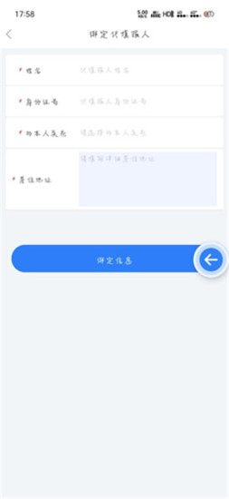 7.输入需要申请健康码的用户身份信息,以及我们和TA的关系,TA的居住地址,点击【绑定信息 】;