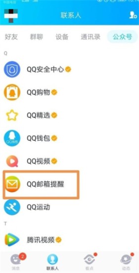 3.打开qq后点击页面底部的联系人小图标。然后在新的界面中再点击“公众号”选项。