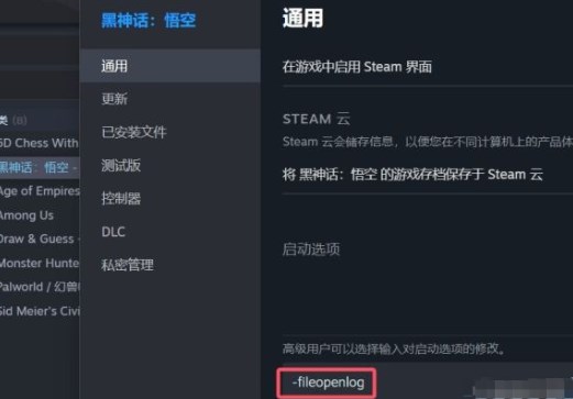 3、将命令 -fileopenlog添加到steam的启动命令中