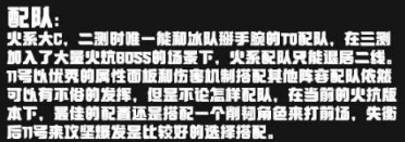 火系大C,二测时唯一能和冰队掰手腕的T0配队,在三测加入了大量火抗B0SS的场景下,火系配队只能退居二线。11号以优秀的属性面板和伤害机制搭配其他阵容配队依然可以有不俗的发挥,但是不论怎样配队,在当前的火抗版本下,最佳的配置还是搭配一个削韧角色来打前场,失衡后11号来攻坚爆发是比较好的选择搭配。
