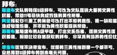 是飚速布的A级平替,打出火系伤害,提供火属性提积蓄值,前期比较容易获取的邦布,非常具有培养的性价比。