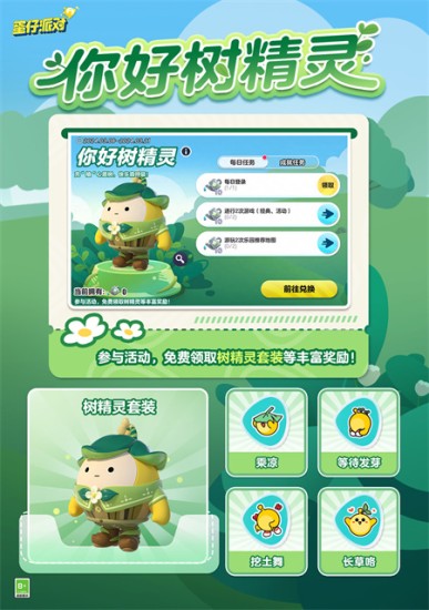 【你好树精灵】活动开启,蛋仔完成任务即可免费获得 树精灵套装 ,更有植树节专属动作 等待发芽 、 挖土舞 以及表情 长草咯 、 乘凉 等蛋来拿!