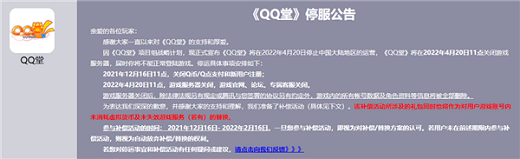 据悉,去年12月,《QQ堂》官方发布停运公告称,因《QQ堂》项目组战略计划,将在2022年4月20日停止中国大陆地区的运营。