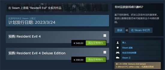 《生化危机4:重制版》将于2023年3月24日正式发售,Steam商店和PS港服商店的预购现已开启,敬请期待。