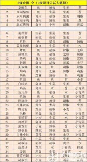 2级食谱有:臭鳜鱼、西湖醋鱼、水东鸭粥、东安子鸡、北京烤鸭、姜丝酱、胡椒酱、鱼鲊、姜丝鸭煲、烤鱼、酒槽鱼、烤鸡、炮燔、炙双鲜、灼鸡、灼鱼、鱼面、白斩鸡、鸡汤、鱼片粥、鱼汤、卧鸡蛋、凉拌黄瓜、糊汤粉、米粉、姜汤面、鸡丝面、油泼面、辣椒酱、乡社小炒、姜汤、胡椒汤、蔬菜汤、姜饭、蔬菜煎饼、胡椒饼。2级食谱相对于1级更加的难了一些,材料的获取难度也稍微加大一丢丢,比如东安子鸡的配方就是:禽肉、辣椒、生姜和葱!