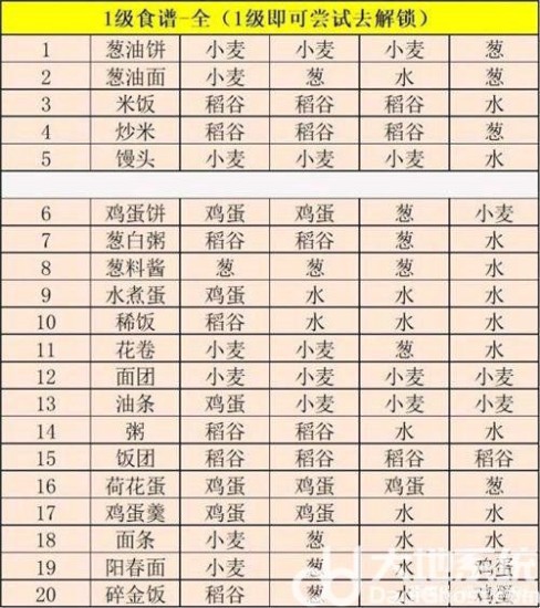 1级食谱有:葱油饼、葱油面、米饭、炒米、馒头、鸡蛋饼、葱白粥、葱料酱、水煮蛋、稀饭、花卷、面团、油条、粥、饭团、荷花蛋、鸡蛋羹、面条、阳春面、碎金饭。1级就可以尝试去解锁了,我们拿鸡蛋饼举例子:鸡蛋+鸡蛋+葱+小麦可以做出鸡蛋饼,前期任务也会要求玩家制作一个鸡蛋饼,小伙伴们按照这个配方制作即可。