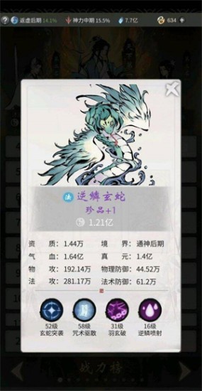 在游戏中羽玄蛇是一只是紫色的高资质灵兽,它的强度还是非常高的。游戏中玩家只要能将羽玄蛇培养起来,那么在战斗中是可以给玩家带来非常大收益的,但是缺点是想要培养好逆鳞羽玄是需要花费非常多资源的,因此建议平民玩家可以根据自己的情况看着培养,该灵兽的具体能力属性如下: