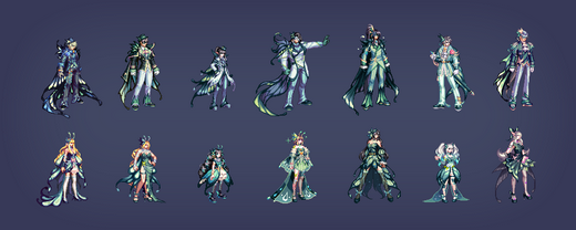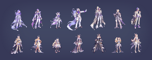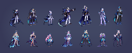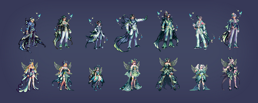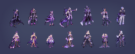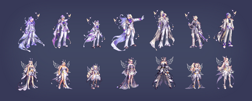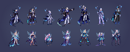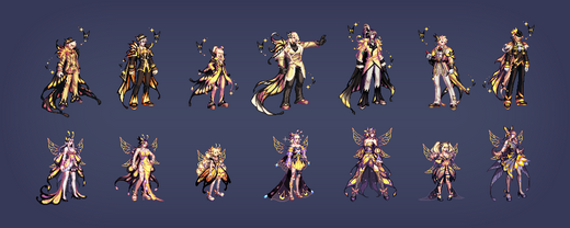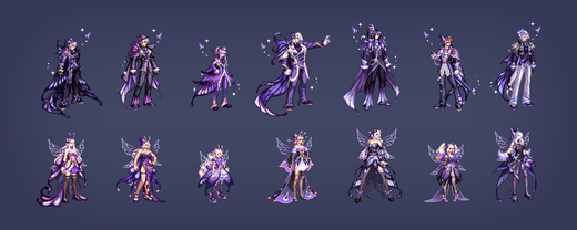 共有5种颜色,第5种(白色)无法直购获得,而是需要通过礼包材料进行兑换,参考今年至尊、耕耘的E色。除此之外每个职业还有两种差分装扮,女性职业为胸部项链/翅膀,男性职业为脸部面具/蝴蝶。