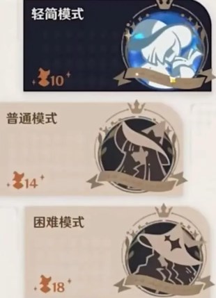 根据难度的不同,入场的角色必须达到足够的数量和等级,否则不能进场。也就是不给你打。难度一共有三个,分别是轻简、普通和困难。轻简模式需要十个角色,等级最少需要60级,一共有三关,两关小怪加一关boss,通关可以获得220原石。普通模式需要14个角色,等级最少要达到60级,一共有六关,四关小怪加两关boss,通关可以获得420原石。困难模式需要18个角色,等级最少要达到70级,一共有八关,六关小怪加三关boss,通关可以获得620原石。