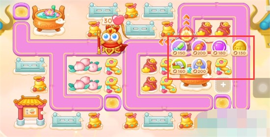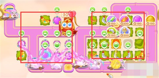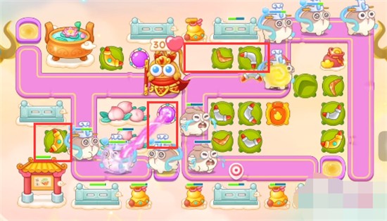 1、本关能够使用的炮塔是:毒针、火瓶、魔法球、便便、回旋镖、闪电炮,这一关我们要使用回旋镖为主力输出。