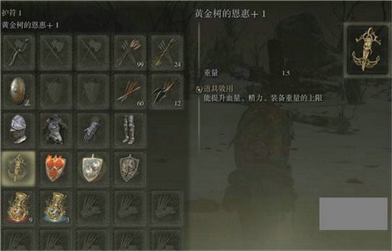 15、黄金树的恩惠+ 2:增加4%最大生命值,10%最大精力值,8%最大负重