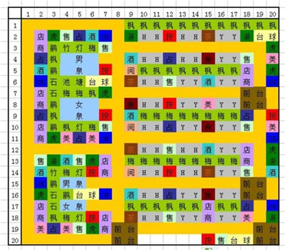 1.一周目的小温泉布局~空白的格子随便放,客房不够放客房,再随便放些商店也是可以的。(PS:图中店商-小卖部 虎-游戏机 游-游艺机 鹃-映山红 酒-咖啡厅 OK-歌厅 售-自动贩卖机 )