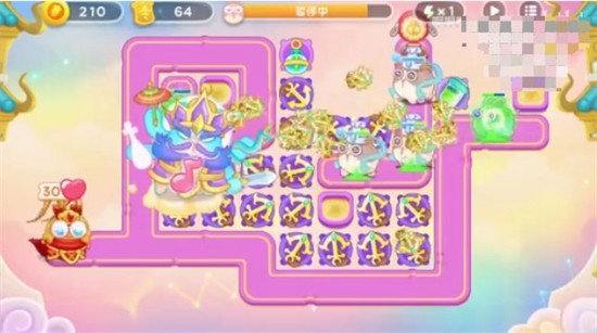 3、之后往左侧放船锚炮,往左侧清理道具,右侧可以先打兔子,记得看好粉色兔子,中期间基本把道具都清掉,在中间区域都放船锚炮就可以了,尽量都满级;