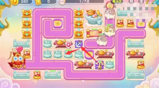 1、开局之后先在右下角的位置放船锚炮,先把上方的那个香炉打掉,放船锚炮,上面的清理道具,下面的打兔子;