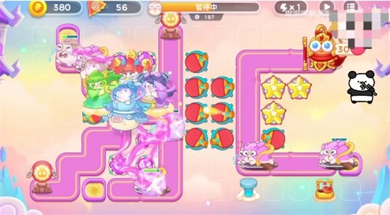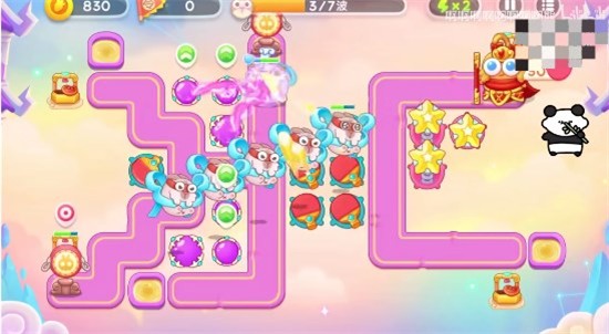 4、合体神仙大部分吗可以锁头,但是到右侧星星塔攻击范围内之后,要先打飞飞兔,可以在萝卜附近多放一些星星塔,守卫好,后期注意好粉兔和飞飞兔就可以过关。