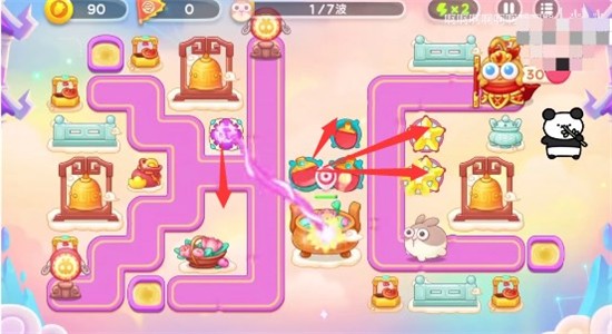 1、开局在中间的两个大缸之间放球拍,左上角钟下面放魔法球,球拍先把右侧钟旁边的打掉,放星星塔,之后锁定旁边的钱袋打,左侧的魔法球打兔子即可,球拍把周围的道具都清理掉;