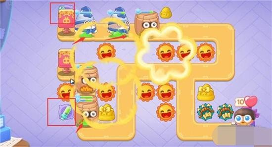 2、在下侧方这个位置也放上太阳花,这对左边和下面的障碍物的消除有很大的帮助。
