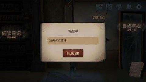 2、点击调查墙壁,跳出许愿单,输入许愿码扔进洞里就可以拿到奖励了。