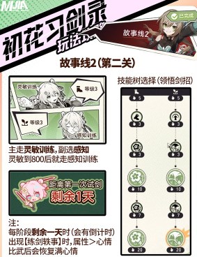 1、开拓者将作为剑术助教,每日安排4次三月七的练剑日程,每日的练剑日程可选择训练、力量、灵敏、坚韧中的一个。