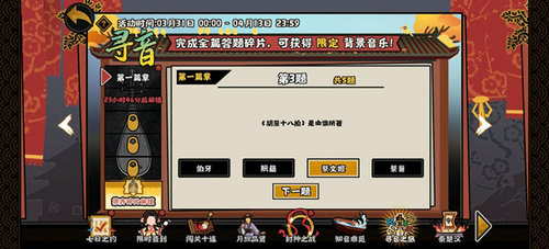 寻音之旅是无悔华夏今天开放的一个特殊活动,时间将持续到4月13日,在这个活动中,玩家只要完成全篇答题碎片,就能获得限定的背景音乐。这里的题目基本都是关于古典音乐的相关内容,这里将跟大家分享寻音之旅的全部答案,比如《胡笳十八拍》是由蔡文姬创作的,这就是第三题的答案。