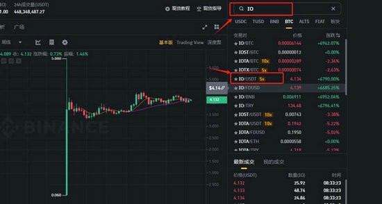 8、搜索币种简称【IO】,选择【IO/USDT】交易对