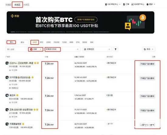 6、在进行现货交易前需要获得USDT,可在“一键买币”——“自选区”——“买入”获得,注意法币需要选择CNY,然后根据需求选择交易商家