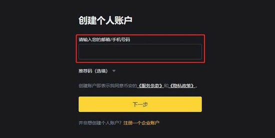 2、币安已全面开放大陆用户进行手机号注册,输入邮箱/手机号、点击下一步即可