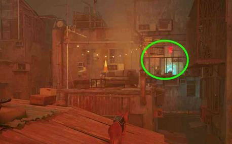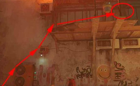 离开Clementine的公寓,往Momo公寓的方向走,回到之前那两个搬油桶的机器人处,向右看,对面的阳台上有一个外界者标志,往那边走。