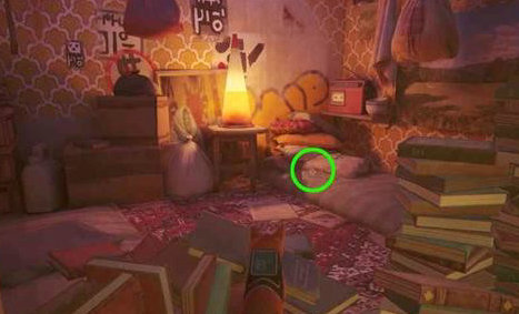 进入房间,来到角落里的卧室,越过书堆后找到一张床,床上有一张纸条,互动后拿到钥匙。