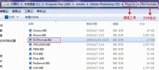 进入PS安装目录中的“Plug-ins”->“File Formats”文件夹下,将下载好的“icoformat_8bi ”插件文件拷贝到该目录下。