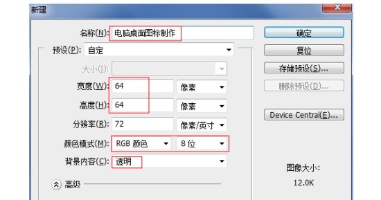 接下来打开PS,新建一个PS文档,大小设置为“64*64”,颜色位数设置为“8”,透明背景,然后点击“确定”按钮。