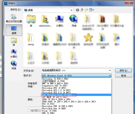 然后在弹出的“另存为”窗口中,将“文件类型”设置为“ICO图标”,最后点击“保存”在桌面即可。