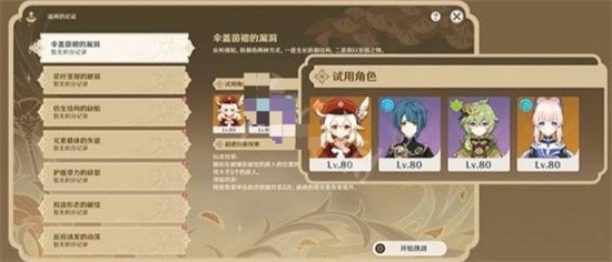 关卡中,旅行者只能使用给定的试用角色进行挑战,每个关卡的试用角色各不相同。试用角色无法产生元素共鸣。