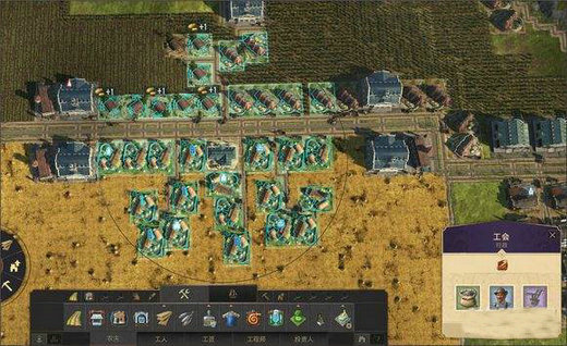 明白以上关系以后,个人认为农业发展是最需要精心规划的。这里也有3个指标,第一使用工会,工会有一定覆盖范围里面可以装配各种游戏道具,也可以理解为提供各种科技人才和高新技术的地方,简单说工会覆盖的地方可以提供各种BUFF,提高各种产业的工作效率。第二就是产地的合理布局,在工会覆盖的地区尽可能多的,塞下各种工厂。第三合理利用土地,农业是无法享受后期电厂电力效率提高的,所以农业用地是很稀缺的。这里也有我自己的布局心得,以上图开局最关键的3样产物为例,土豆、小麦、啤酒花为例。其中小麦是最关键的,是面包,啤酒的原材料而且需求量都很大。我这里最大限度的利用工会BUFF塞了18个小麦田。还只是一边的。这和1404不一样,虽然摆的不是很整齐,但是我们要的是效率。也就是产业最大化。