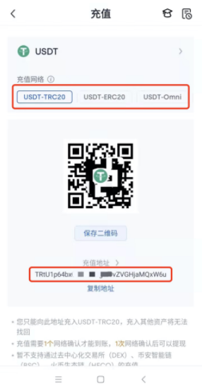 3、以USDT为例,选择充值网络,保存二维码或者复制下方充值地址。