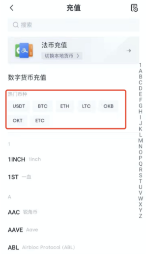 2、如果是进行数字资产充值,可以选择您要充值的币种,如果不是热门币种可以在上方搜索框搜索您要充值的币种。