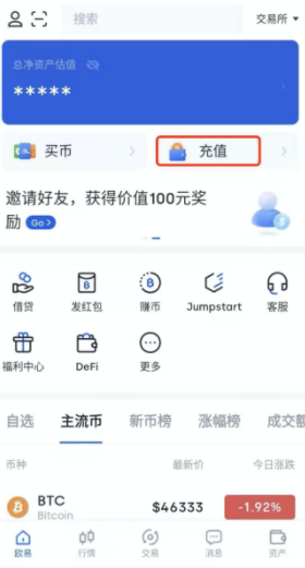 1、打开ok交易所app,点击【充值】按钮。