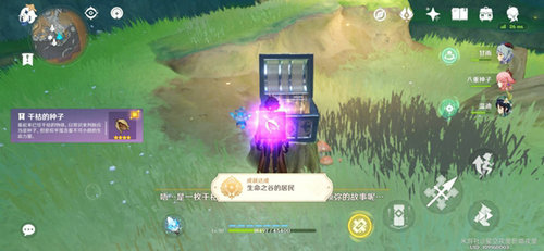 我们来到树上用元素视野观察,会发现有三片小树叶,都摘取后我们激活下面的元素柱子,激活后开启中间的精致宝箱,可以隐藏成就【生命之谷的居民】,和一个隐藏道具【干枯的种子】,从派蒙的嘴里可以得知这个道理有关须弥